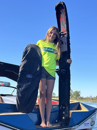 | Kate is very passionate about water skiing. She keeps one thing in her mind: "to take the good out of the bad sets and come back later and do better than ever!" Kate is from Burlington, Wisconsin and started her skiing career with the Aquanut Waterski Show Team. 2024 was only the second time she competed in 3-event Regionals and Nationals as she started 3-event waterskiing in 2023. She says, "while I started not long ago, I just put in the work to keep improving." She is not done yet as she will keep pushing. Kate’s 64ft jump helped her win Jump & Overall at 2024 Midwest Regionals which she followed up with a 70ft jump which earned her 1st place in Jump at 2024 Nationals and 2nd place Overall. Kate represented the Midwest for the National Junior All-Star Team where the Midwest took home GOLD at 2024 3-Event Nationals. Something she will never forget is the words of encouragement her family provides to her! Kate’s favorite event is jump but she enjoys many things on the water including surfing, knee boarding with cousins, and double tricking with her brother, Jacob! Kate also loves to snow ski and competes in Alpine Racing with SWATeam. She has been skiing as long as she can remember. Kate’s heart belongs to both waterskiing and snow skiing. |